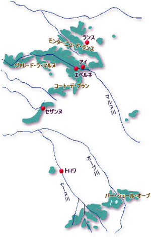 白い果汁の黒フドウで、主にモンターニユ・ド・ランスとコート・デ・バールの一帯で栽培されており、